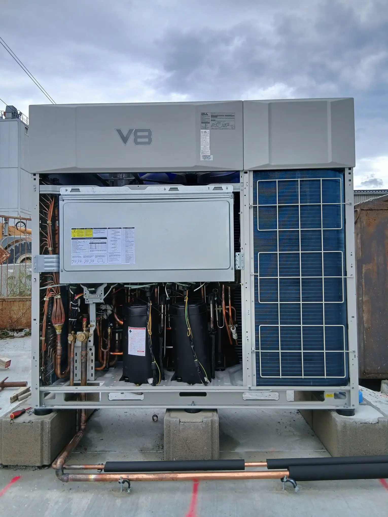 Vykurovanie a chladenie Haly VRF tepelným čerpadlom Midea 85 kW , 7 x vnútorná 16 kw stropná jednotka ktorá cez leto vychladí a cez zimu vykúri